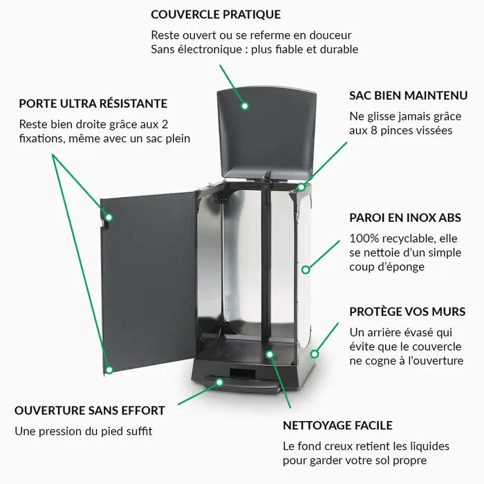 Compatible avec des sacs de 50L ou 2 x 30L grâce aux pinces en inox.